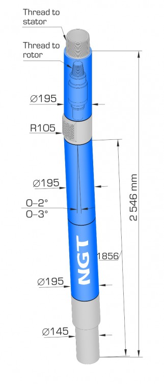 The bearing section is used in PDM power sections of 195 mm diameter and for drilling oil and gas wells with 215.9 – 269.9 mm rock and PDC bits.