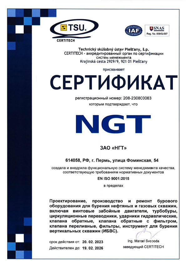 ЗАО "НГТ" неуклонно соблюдает и выполняет требования, закреплённые в международных стандартах. Система менеджмента качества предприятия сертифицирована на основе стандарта EN ISO 9001:2015 аккредитованным органом по сертификации TSU применительно к проектированию, производству и ремонту бурового оборудования для бурения нефтяных и газовых скважин, включая гидравлические забойные двигатели, турбобуры, циркуляционные переводники, ударники гидравлические, клапаны обратные, клапаны обратные с фильтром, клапаны переливные, фильтры, инструменты для бурения вертикальных скважин.